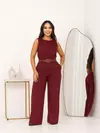 Conjunto Elegante Calça Pantalona Plissada e Cropped Top De Alça Com Detalhe De Amarração No Busto